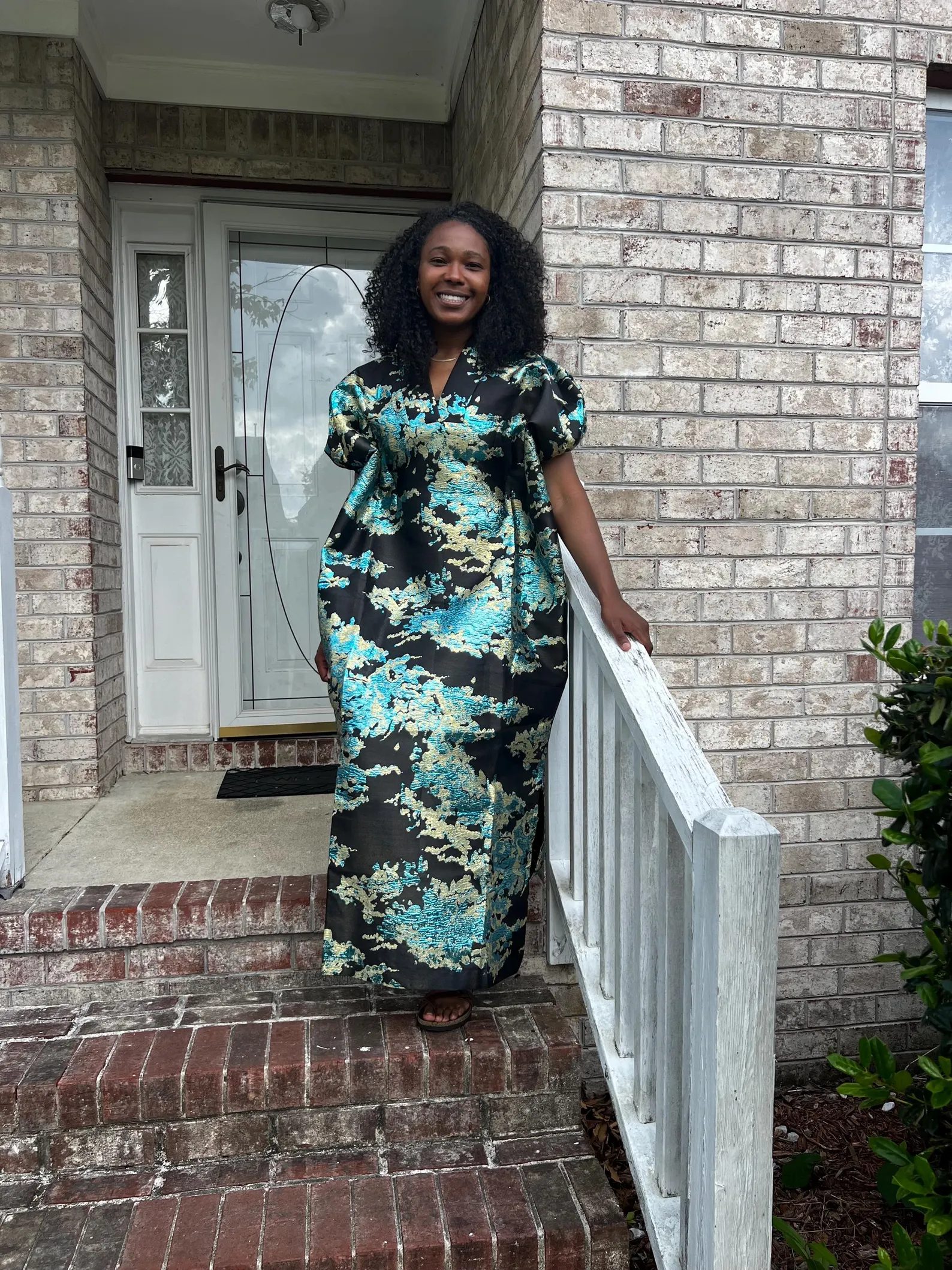 DESIGN FEATURES: Elegant African-style bubu dress with intricate damask brocade geometric patterns and decorative beads or aso-oke at the neckline