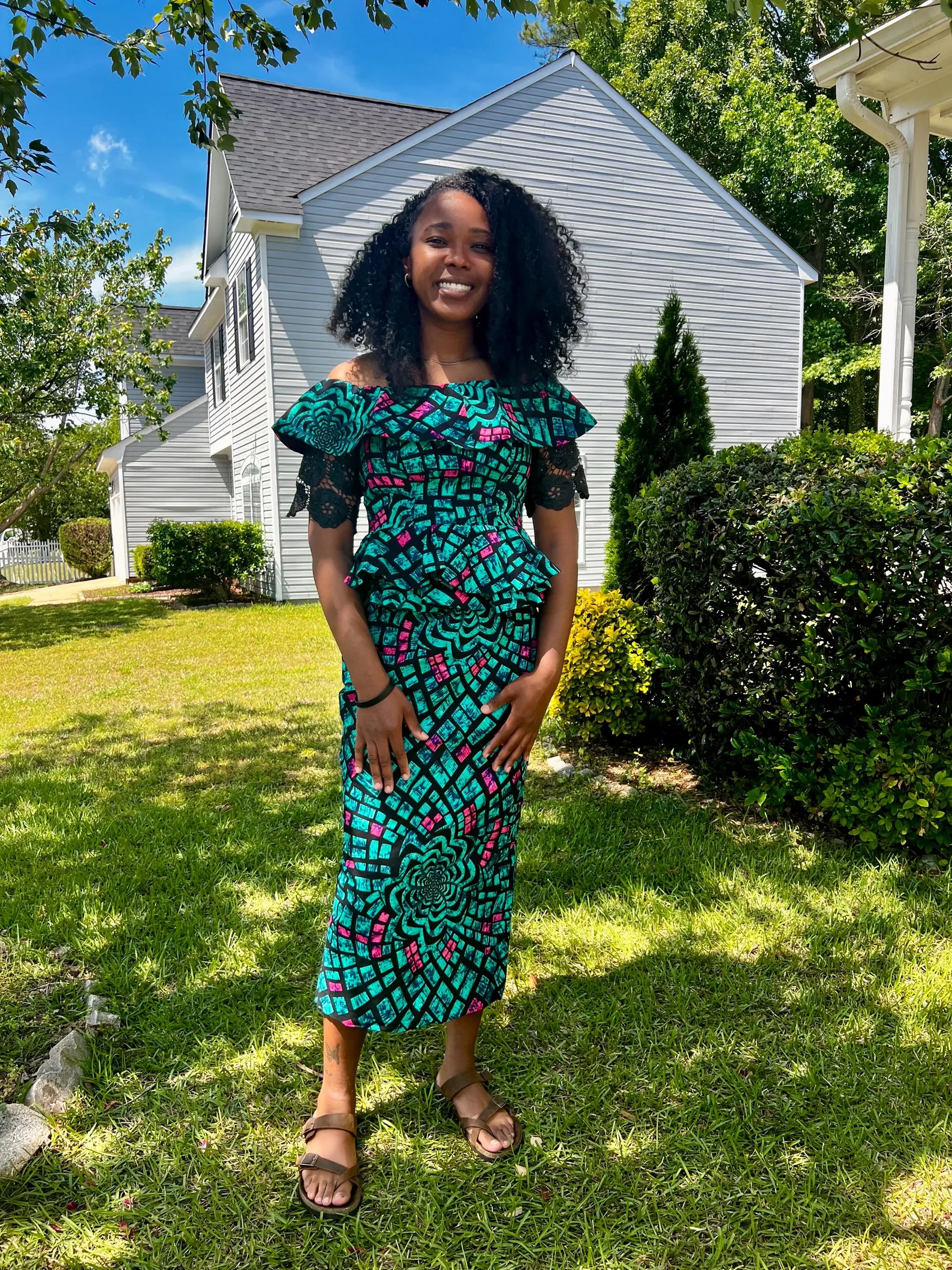 Make a bold fashion statement with this stunning African print Skirt and Blouse that seamlessly blends traditional patterns with contemporary style. The dress features eye-catching abstract prints in vibrant colors, creating a dynamic visual appeal. The elegant A-line silhouette is enhanced by distinctive short Cord sleeves that add a touch of drama and sophistication.