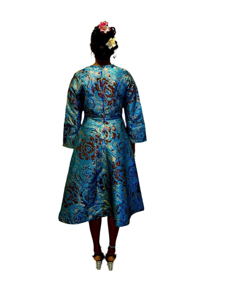 Make a stunning entrance in this luxurious brocade evening gown featuring an enchanting blend of Blue and royal Brown hues. The sophisticated A-line silhouette is adorned with a mesmerizing abstract floral pattern that catches and reflects light beautifully. Crafted with long sleeves and a flattering square neckline, this dress combines classic elegance with modern artistry. The fitted bodice flows into a graceful full skirt, while the metallic sheen adds dramatic flair to any formal occasion. The structured fabric maintains its shape throughout wear, making it perfect for galas, formal dinners, or special ceremonies. Accessorize with gold jewelry to complement the dress’s rich jewel tones and create an unforgettable evening look.