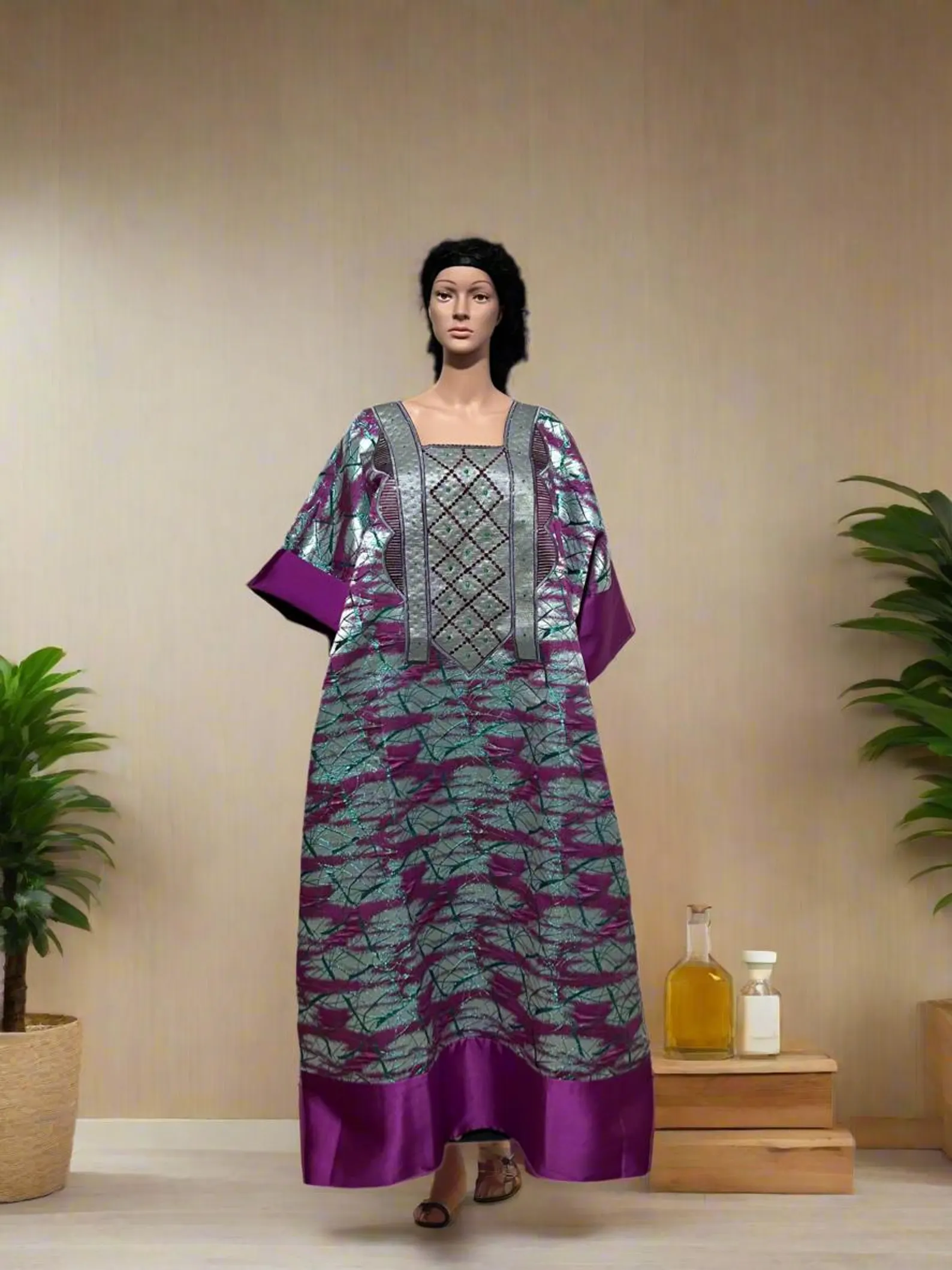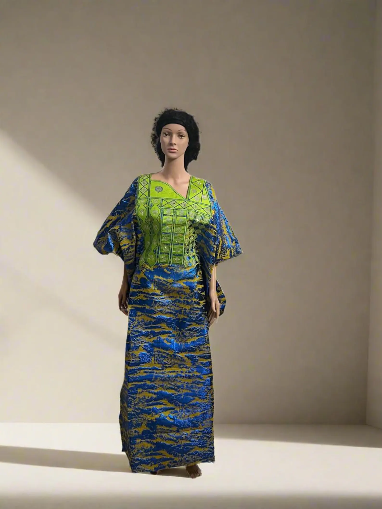 DESIGN FEATURES: Elegant African-style maxi dress with crew neckline, bell sleeves, and a flowing silhouette for maximum comfort