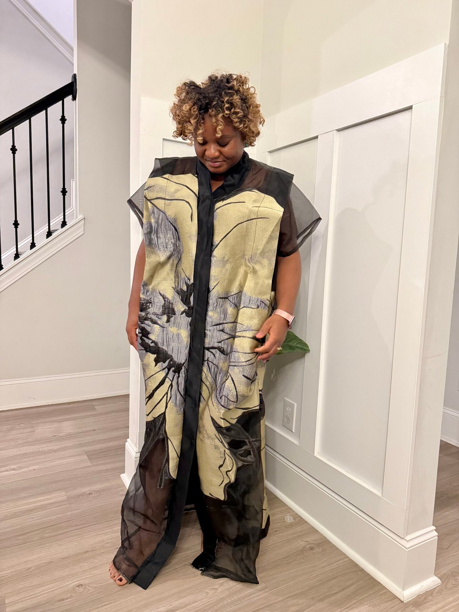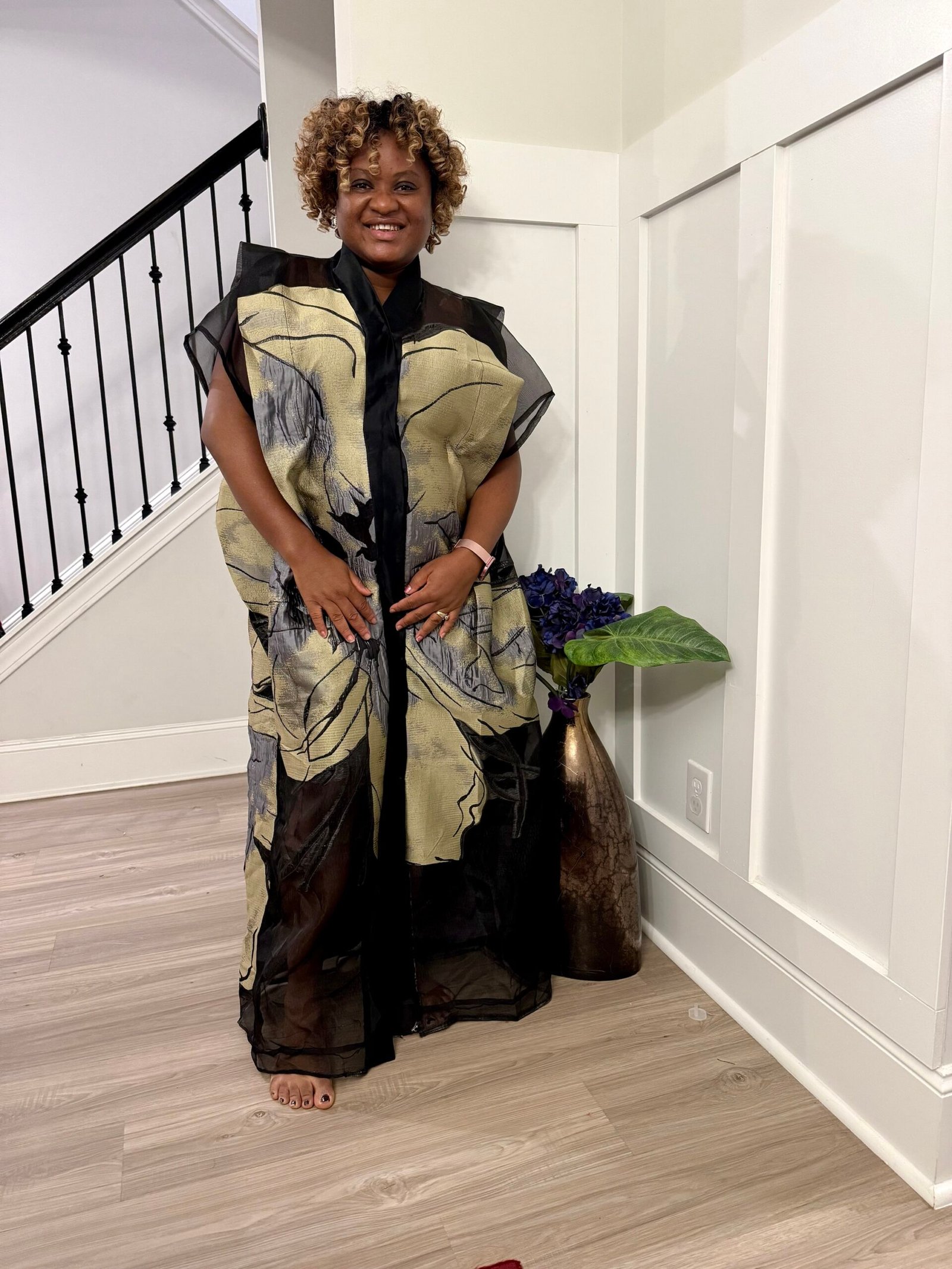 Make a stunning statement with this luxurious African-inspired maxi dress showcasing exquisite brocade . The elegant neckline and dramatic bell sleeves create a regal silhouette. The loose-fitting, flowing design offers both comfort and grace, while the contrasting black hem adds a polished finish. The bodice features a unique diagonal pattern that complements the overall design. Perfect for special occasions, formal events, or cultural celebrations, this maxi dress combines traditional aesthetics with contemporary style. The generous cut and premium fabric ensure a comfortable fit for various body types.